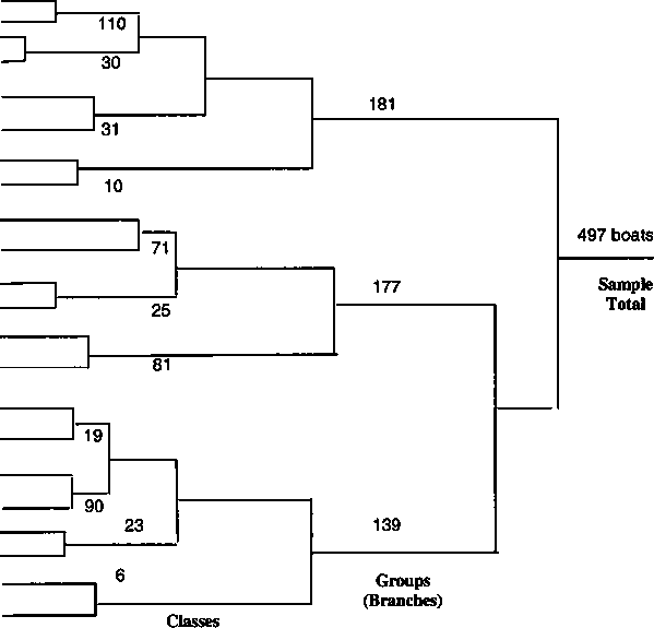 The result of profiling fleet exploitation strategies is illustrated by the example of the Moroccan coastal fleet (see Figure 6). It may be recalled that the goal is to obtain a classification of the 497 boats for a representative sample of the fleet, according to the exploitation strategies implicit in their fishing operations (see Annex I and Annex III for the "fleet operations" heading of the questionnaire and the list of coded variables). The term "fishing operation" (or campaign) is used to label the ensemble of place, gear, time and target of fishing. A difference in one of these criteria (example, a different fishing zone) requires the coding of a new fishing operation, and each boat could carry out several fishing operations during the year prior to the investigation.