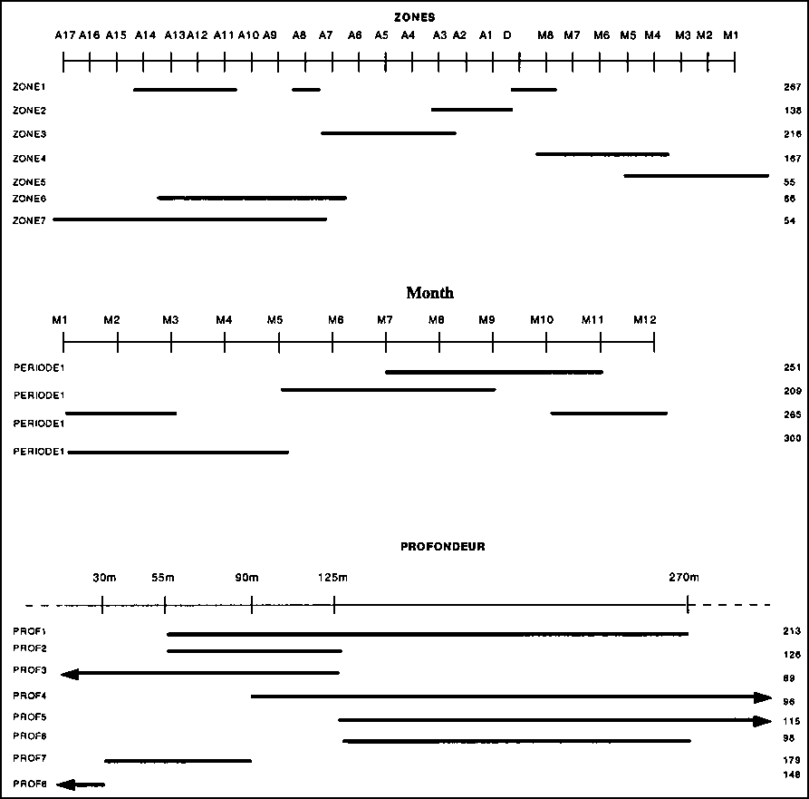 Fishing operations are described by a very large number of variables and in certain categories, this number is much higher than in others (species = 73; month = 12, zones = 26). It is thus necessary from the start to make a synthesis under each category defining a single qualitative variable with an equivalent number of modalities: this is obtained by carrying out a classification by heading. For example, each fishing operation is characterized by the species captured. At maximum there are 8 species taken in an operation (certain trawlers) out of the total of 73 different species listed from the sample unit. The classification of fishing operations described by the presence or absence of the 73 species makes it possible to group the operations on the basis of the type of species caught. The number of the class corresponding to the type of species captured during the operation is then given to each operation, and the result of the classification is thus equivalent to a new qualitative variable in which the number of modalities is equal to the number of classes. This process is applied 4 times, to the species caught, the zone, the period and the depth of fishing.