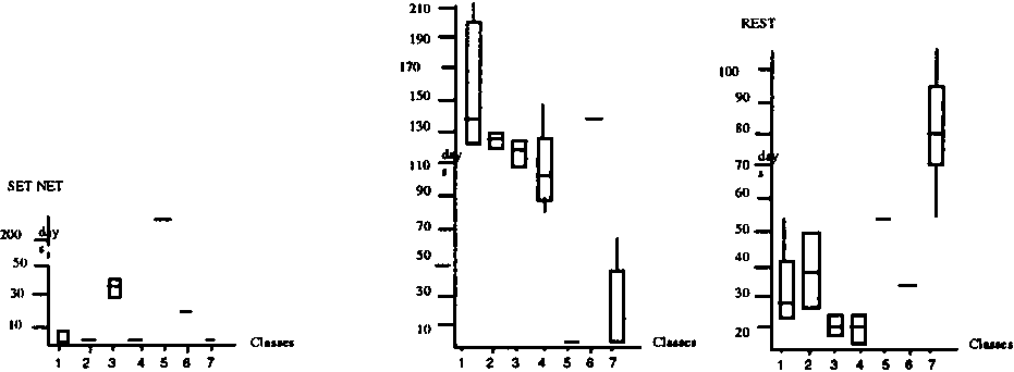 Analysis of captured species (1 064 operations × 73 species) The classification tree exhibits a very clear structure with 5 branches: 2 important classes are distinguished (I: 329 operations and V: 482 operations) corresponding respectively to 79% of the operations of the sardine boats and 89.8% of the trawlers (this latter class does not however consist entirely of trawler operations but includes 14% others): - class I (329 operations) corresponds to catches of pelagic species: sardine, anchovy, mackerel, scad; constituting 79 % of the sardine boat operations; - class II (115 operations) is characterized by captures of tuna and tuna-like species: skipjack, bluefin tuna, frigate tuna, bonito; constituting 47% of longliner operations, 46% of sardine boats and 6% of mixed-purpose boats (sardine boat-longliner); the use of drift gillnets particularly ... this class is unexpected and requires verification; - class III (96 operations, characterized by the swordfish and gillnets, is composed of 75.7 % of longliner operations and 10.2% of sardine boat-longliner; with the same comment as for the preceding class; - class IV (42 operations) is characterized by: scorpion fish, spiny lobster, pandora, sea bass, sea bream, grouper, Couch's sea bream, conger eel, John Dory, lobster, moray eel, composed 66.8% from operations of longliners using longlines and trammel nets; - finally class V (482 operations) corresponds to the demersal species: hake, sole, shrimp, octopus, mullet, cuttlefish, sea bream, John Dory, composed 89.8 % of trawlers. The raw data suggests an identification problem in classes II and III: concerning drift gillnets used by longliners. Verification by field experts is necessary but it could also be a coding problem. Finally, each fishing operation is characterized by a new qualitative variable of 5 modalities (number of the class of membership from 1 to 5) summarizing the type of species caught. Analysis of fishing zones visited (1 064 operations × 26 zones) A classification of the presence/absence of the 26 basic zones frequented shows that there are 7 principal geographical ranges exploited during the course of fishing operations: these results are illustrated in a graphic form as Figure 8. Two classes (II, III) correspond to operations taking place in the northern Atlantic, which covers the zone of the Straits; classes IV and V relate to operations in the western and eastern Mediterranean respectively, and classes VI and VII, of less significance, consist of groups of operations carried out in the southern and extreme southern Atlantic. Class I, the largest, includes within its group several "other operations" which correspond to a more restricted heterogeneity of range: Tan-tan/Laayoune, Agadir and/or Tangier. An automatic classification often gives a heteroclitic (anomalous) class which groups individuals which are different, but which do not fit into the other classes defined. Analysis of the fishing period (1 064 operations × 12 months) The classification tree leads to the definition of 4 very clear classes: The first semester of the year (January-June), the warm season from May to September, the cool period from October to March, and the second semester of the year (Figure 8). Analysis of bathymetric classes (1 064 operations × 6 depths) The same treatment is carried out on the depth-classes in order to define the bathymetric ranges fished during the course of operations. The classification tree reveals 8 classes (Figure 8): the first zone between 55 and 270 meters is more characteristic of the trawlers (64 percent, comprising 37 percent of the trawling operations), whereas the shallow depths (classes III, VII and VIII) are associated with the seine; classes IV, V and VI, characterized by higher bathymetry, and correspond more to the north Atlantic zone and the Mediterranean, associated with the trammel net, gillnet and pelagic longline (Annex V). It is important to note that for the depth-classes with a strong relationship to a particular gear-type, this variable will not be used in profiling operations; it will be only needed in the analysis as a supplementary variable. |