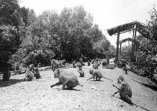 Among the terrestrial mammals, after mangrove restoration, the species with the most numerous individuals in the mangroves is the macaque (Macaca fascicularis), which lives in troops of 30 to 40 along the rivers and canals. Groups of wild boar (Sus scrofa) are abundant in Phoenix paludosa patches.