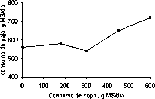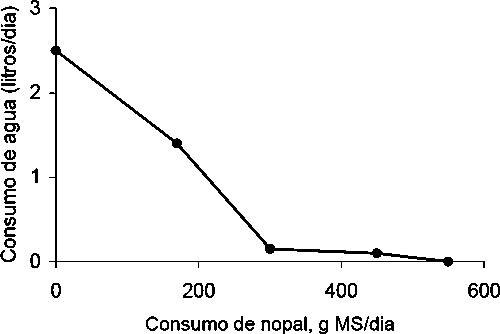 En Túnez, Nefzaoui y Ben Salem (1998) mostraron que los animales no beben agua cuando el consumo diario de cactus es cercano a los 300 g de materia seca. El volumen del agua que toman los animales se redujo de 2,4 litros para la dieta del testigo, a 0,1 litros cuando el nivel de cactus sin espinas era superior a 300 g de MS, inclusive dejaron de beber en al nivel mas alto de consumo de cactus (Figura 5).