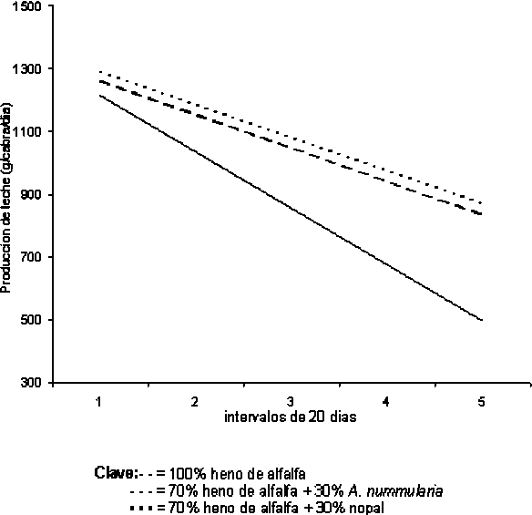 (iii) El reemplazo de heno de alfalfa con 30 por ciento de A. nummularia, no afectó significativamente el consumo de materia seca, pero tuvo un efecto negativo en el peso del animal y redujo significantemente la producción de leche.