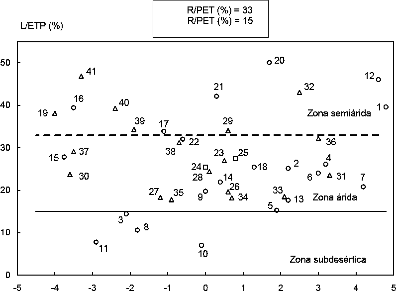 La información colectada en 40 estaciones climáticas fue clasificada (Le Houérou, 1999) basándose en dos índices principales: a) la relación entre la lluvia (R) y la evapotranspiración potencial (EP), L/EP, para representar el estrés hídrico, y b) la temperatura media diaria del mes mas frío (m), que representa al estrés térmico invernal.