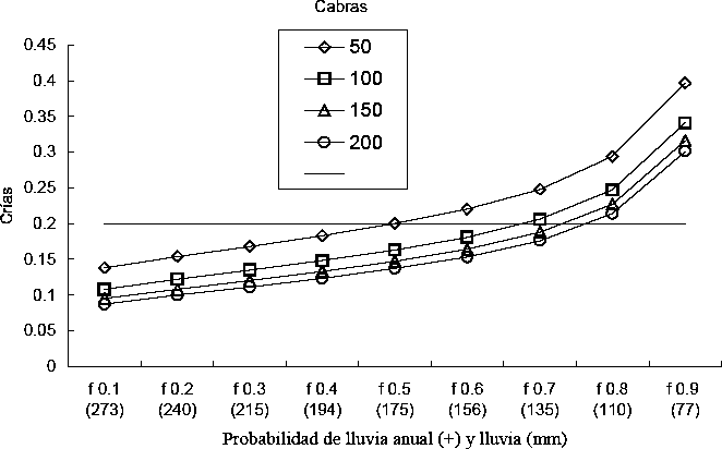 Un modelo de simulación examinó los costos y beneficios derivados de la introducción de plantaciones de nopal en estos sistemas de producción de cabras. Se generaron varias probabilidades mediante la variación del tamaño del rebaño (50, 100, 150 o 200 unidades y la probabilidad de lluvia anual (f), de 0,1 a 0,9.