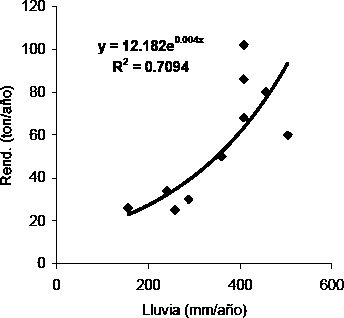 Figura 14. Rendimiento O. ficus-indica var. inermis y lluvia en Túnez (adaptado de Monjauze y Le Huérou, 1965)