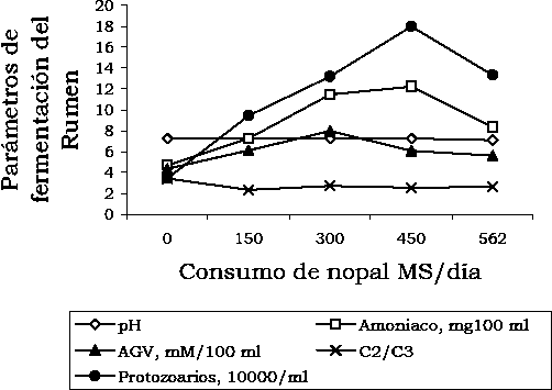 v) Hay un incremento de el consumo de alimentos fibrosos, y los ácidos grasos volátiles del rumen, el conteo de protozoarios del rumen, así como la concentración de amoniaco.
