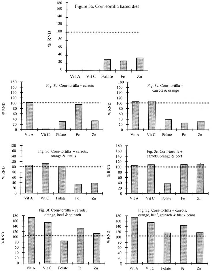 Including foods in the diet, which have high micronutrient density - such as pulses or legumes, vegetables (including green leafy vegetables), and fruits - is the preferred way of ensuring optimal nutrition including micronutrient adequacy for most population groups. Most population groups afflicted by micronutrient deficiency largely subsist on refined cereal grain or tuber-based diets, which provide energy and protein (with improper amino acid balance) but are insufficient in critical micronutrients. Figures 2-5 and Tables 1-4 included at the end of this chapter illustrate how addition of a variety of foods to the basic four diets (white rice- Figure 2, corn tortilla- Figure 3, refined couscous- Figure 4, and potato- Figure 5) can increase the nutrient density of a cereal or tuber-based diet. There is a need for broadening the food base and diversification of diets. Much can be gained from adding reasonable amounts of these foods, which will add micronutrient density to the staple diet (Table 1, 2, 3 and 4).