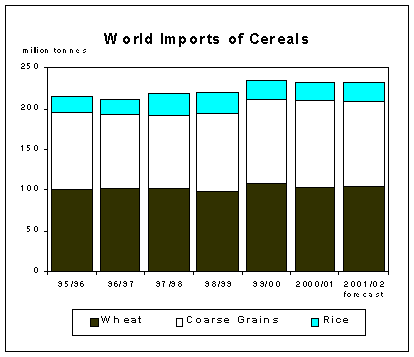 World cereal trade in 2001/02 is forecast to remain unchanged from the previous season's volume, now estimated at around 233 million tonnes. Total cereal imports by the developing countries are also expected to remain close to the 2000/01 level, at around 171 million tonnes. Of this total, some 74.5 million tonnes are expected to be imported by the LIFDCs, up 2.3 million tonnes from the previous season. On an individual commodity basis, wheat and rice imports are expected to expand slightly, while trade in coarse grains could decline. Overall, higher cereal imports in Asia could offset the anticipated declines in other regions.