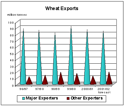 World trade in wheat and wheat flour (in wheat equivalent) in 2001/02 (July/June) is currently put at 105 million tonnes, up 1.5 million tonnes from the previous season. However, at 82 million tonnes, wheat imports by the developing countries would be 2 million tonnes higher than last year. Most of this increase is expected in the LIFDCs, where wheat imports are forecast to reach 40 million tonnes. The largest regional expansion in wheat imports in 2001/02 is forecast for Asia, where aggregate imports could reach 50 million tonnes, up nearly 4 million tonnes from the previous season. In addition to large anticipated shipments of wheat as food aid to Afghanistan, several countries are likely to add to their foreign purchases, namely China, Japan, the Republic of Korea and Turkey. By contrast, Pakistan and India will have no need for imports for the second consecutive season, while imports by the Islamic Republic of Iran, the regions largest wheat importer in recent years, could decline slightly below the previous year's near-record volume.
