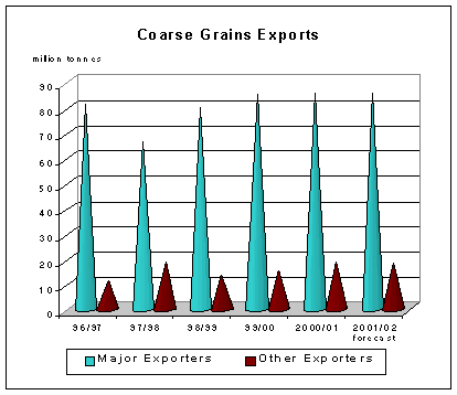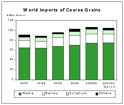 World trade in coarse grain in 2001/02 (July/June) is forecast to decline to 104.5 million tonnes, down 2 million tonnes from the previous season. This decline mostly reflects lower expected imports by the developing countries, although imports by the LIFDCs are likely to remain close to last season's volume. Among the major coarse grains, only maize trade is forecast to expand this season, to around 74 million tonnes, whereas, trade in barley and sorghum could decline slightly, to 17 million tonnes and 8 million tonnes, respectively.