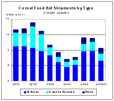 The decline in cereal food aid shipments in 2000/01 was most pronounced in terms of wheat, which fell by about 2.6 million tonnes. Coarse grain shipments also declined, by over 400 000 tonnes. By contrast, those of rice rose by more than 300 000 tonnes. Total cereal shipments as food aid to the Low-Income Food-Deficit Countries (LIFDCs), as a group, fell slightly in 2000/01, to 7.4 million tonnes or some 160 000 tonnes smaller than in 1999/2000. Largest declines were registered for Bangladesh (260 000 tonnes), Ethiopia (250 000 tonnes), Indonesia (177 000 tonnes), India (172 000 tonnes) and Rwanda (127 000 tonnes). However, shipments to several countries also increased; namely, to the Democratic People's Republic of Korea (651 000 tonnes), Kenya (204 000 tonnes) and Eritrea (130 000 tonnes).