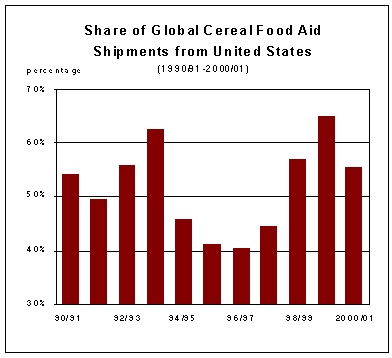 Cereal food aid from the United States fell by around 2.5 million tonnes in 2000/01 to 4.7 million tonnes; shipments to the Russian Federation fell from 1.9 million tonnes provided in 1999/2000 to only 127 000 tonnes. However, even at this reduced level, the United States was the largest donor, contributing to more than 55 percent of global shipments in 2000/01. Cereal aid shipments from a number of other major donors, including the EC and Canada, also registered a sharp decline in 2000/01. The fall from the EC was most pronounced, as total shipments declined by over 33 percent, to 1.5 million tonnes. Most of the decline was associated with lower shipments to the Russian Federation and the Democratic People's Republic of Korea. By contrast, shipments from Japan rose by more than two-fold, to 720 000 tonnes, largely because of increased shipments of rice to the Democratic People's Republic of Korea.