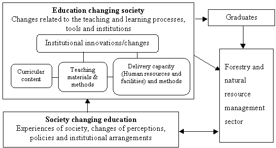 People mould education and education moulds people. Life experiences contribute enormously to the way we think and do things. The lessons we learn over time are captured into educational programmes that become beneficial to younger generations. This puts society in a dynamic state of transformation, with knowledge management as a major factor affecting what is done and how it is done. This philosophy is captured in Figure 1 below, using the education system in the context of forestry and natural resource management. This model illustrates that education changes continuously as a response to changes in society. By developing institutional arrangements, curriculum content, teaching methods and delivery capacity, the education system contributes to changing the society. It must be noted that although the main pathway for knowledge to reach society is through education, knowledge enters society through various other pathways too.