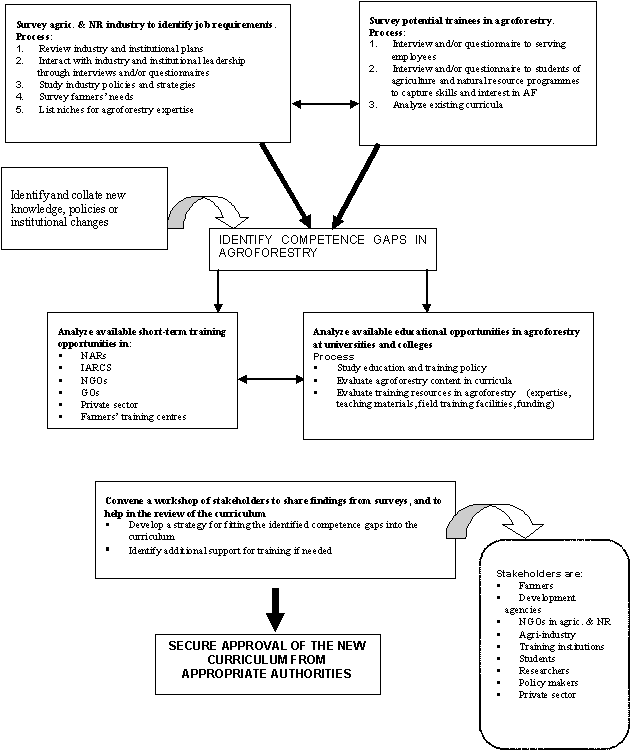 Using an example in agroforestry we have illustrated the process in a flowchart format (Annex 1). Whether one is developing a new curriculum or reviewing an existing one, there are two considerations: Who does it, and how it is done (the process). We discuss some common approaches in use worldwide. The first and indeed the most common one is the classical approach. In this approach, a thorough analysis of training needs is undertaken and this helps to define the learning objectives. The aims of the training are set. Then a small group of experts/officials is appointed to draw the curriculum and provide clear implementation and evaluation guidelines. This approach is top-down, and assumes that the small group of experts will provide the best know-how and work in the interest of all stakeholders.