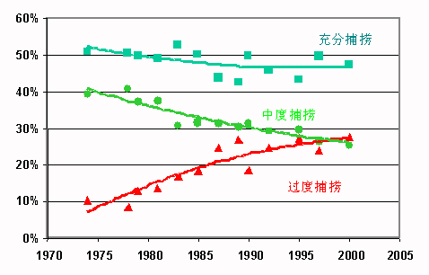 在2001年10月雷克雅维克大会上,粮农组织近期总体情况报告中的几条引证(Garcia与De Leiva Moreno,2001)说明了这种观点。粮农组织称经过五十年特别快速的地理拓展、技术进步之后,年捕捞量已增加数倍,海洋渔业目前正处在十字路口。随着大部分渔业资源或被过度开发,或被开发殆尽或已经被深度开发,现行渔业体系的可持续性受到质疑。粮农组织并未强调捕捞业产量的任何增长。相反,它指出报告的捕捞量于二十世纪八十年代中期达到约8000万吨,此后始终在8500万吨左右波动,到了九十年代年增长率几乎下降到零,表明按照现有捕捞方式,平均而言世界海洋捕捞生产已到达极限。粮农组织进一步指出,过去二十五年中,全球过渡捕捞种群的比例一直在上升,尽管其速度可能略微下降。该信息证实了粮农组织在七十年代初期作出的估计,即全球海洋渔业潜力约为1亿吨,其中仅8000万吨适合实际捕捞。粮农组织,还指出,资源状况及产业统计数据的质量需要大幅度提高,以便对管理工作的状况进行更好的监测和评估,现有资料清楚地说明了过渡捕捞种群比例的上升及过度捕捞在全世界海洋范围内的蔓延。