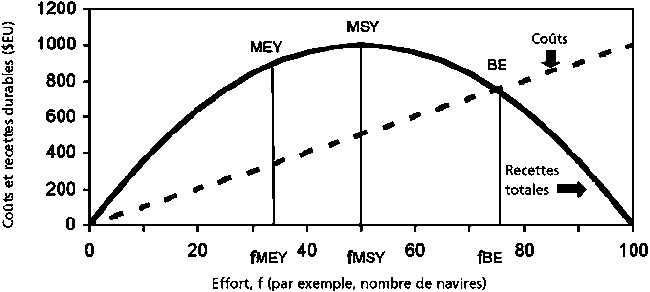 D'autres points de référence prennent en compte l'efficacité économique de la pêcherie, notamment le rendement économique maximal (MEY), ainsi que le taux de mortalité par pêche (FMEY) et l'effort (fMEY) qui permettent de réaliser le rendement économique maximal. On peut les estimer en se servant par exemple du modèle de Gordon-Schaefer (figure 4), qui combine une courbe de la production excédentaire pour le stock en question avec la corrélation qui existe entre le coût de la pêche et l'effort de pêche. Le modèle de Gordon-Schaefer peut aussi être utilisé pour estimer l'équilibre bioéconomique théorique (BE) dans une pêcherie d'accès libre, c'est-à-dire le point auquel les coûts et les recettes sont égaux, ce qui fait que la pêcherie n'attire pas de nouveaux pêcheurs (figure 4).