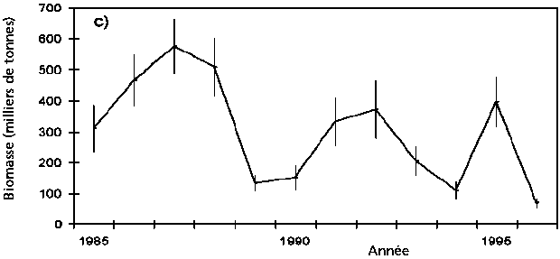 Toutes les méthodes d'évaluation des stocks exigent que l'on fasse des hypothèses sur les données et la dynamique de la ressource. Deux hypothèses courantes et importantes sont que la capture par unité d'effort (CPUE) est proportionnelle à l'abondance ou à la biomasse de la ressource, et que le taux de mortalité naturelle, M, reste constant pour tous les âges des poissons et tout au long des années. Les hypothèses derrière toute évaluation des stocks, en réalité toute source d'information et de décision, sont importantes, et il faut en tenir compte lorsqu'on utilise les informations ou qu'on prend des décisions. L'utilisation des analyses par recrue (et la plupart des analyses des fréquences de longueur auxquelles on a souvent recours pour estimer des paramètres tels que les taux de croissance, ainsi que des analyses du taux global de mortalité par recrue) supposent que le recrutement restera constant. En fait, l'une des plus grandes sources d'incertitude dans la dynamique des ressources, et donc dans l'aménagement des pêcheries, est la très forte variabilité d'une année à l'autre du recrutement des juvéniles pour un stock, qui peut varier selon un ordre de grandeur ou davantage d'une année à l'autre (figure 7). Lorsque les scientifiques fournissent des avis sur les effets des mesures d'aménagement, ils devraient aussi examiner l'incidence de la variabilité du recrutement sur leurs résultats et sur la réalisation des objectifs opérationnels.
