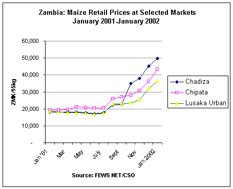 Prices of maize, which started to rise in early July when normally they should have been declining, had on average risen by more than 100 percent by January 2002 (see graph below), reflecting the slow pace of imports. In some rural areas increases have been in the order of 200 percent. The highest rises have been registered in eastern parts of the country. In Chadiza in Eastern Province, maize meal was selling at 50 000 Kwacha per 25 kg bag in late January, compared to around 20 000 Kwacha five months earlier.