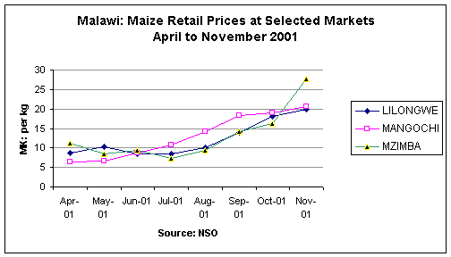 By September last year, prices of maize were more than double their level at the beginning of the marketing year in April (see graph below). ADMARC prices, quoted at 5 Kwacha/kilo in July, reached 17 Kwacha/kilo in August. This reflected the depletion of domestic supplies, an increase of South African maize prices and the depreciation of the Malawi Kwacha. In areas closer to the Tanzania and Mozambique borders, prices have been lower, reflecting substantial cross-border inflows of maize. By November, prices had reached nearly 29 Kwacha/kilo in some locations. Reacting to further price increases in recent weeks, the Government has banned private traders from buying maize from NFRA, and ADMARC is now the only agency selling imported maize. The high maize prices have severely curtailed access to food for large sections of the country's population. These include rural households which suffered reduced harvests and urban households whose purchasing power has been seriously eroded.