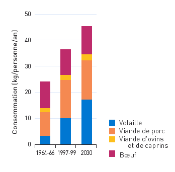 La consommation annuelle de viande par personne sur l'ensemble des pays en développement a plus que doublé entre 1964-66 et 1997-99, passant de 10,2 kg à 25,5 kg par an, soit une hausse annuelle de 2,8 pour cent. Si l'on exclut la Chine et le Brésil, la croissance est alors bien inférieure (de 10 kg à 15,5 kg). La hausse a été particulièrement rapide pour la volaille, la consommation par personne ayant plus que quintuplé. La consommation de porc a aussi fortement augmenté; toutefois la majeure partie de cette augmentation a eu lieu en Chine.