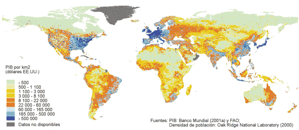 En contraste, regiones de los Estados Unidos, Europa occidental y la zona templada del Asia oriental a menos de 100 km de la costa representan solamente el 3 por ciento de la superficie habitada del mundo. Sin embargo, alojan al 13 por ciento de la población mundial y producen al menos el 32 por ciento del PIB mundial.