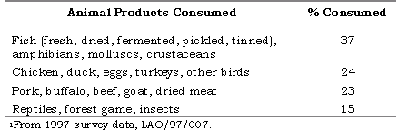 Since livestock is grown for income generation, meat is often eaten sparingly and augmented with fermented fish and vegetables. Wild game, reptiles and insects are foraged extensively in forests and woodlands, although pressure on this resource has resulted in depletion. The ability to produce fish through aquaculture is extremely popular, since it provides food for the house, a supply of fresh fish into the dry season and can also generate income. The total per capita consumption of animal products was estimated at 37-64 kg/capita/yr. Of this animal product consumption, aquatic products (17-23 kg/capita/yr) provided 22-55% (Table 2). Actual fish consumption ranged between 10-19 kg/capita/yr.