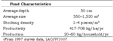Minimising risk is a principal strategy in subsistence farming, and this is reflected in the low input and low productivity of Lao rural aquaculture. Average pond size ranges between 550-1,520 m2, with water depth of about 50 cm. Productivity is low (417-708 kg/ha/yr) due to low stocking densities (1-4 fish/m2) and limited feeding. Low-input aquaculture systems are not disease prone, but may become so during the dry season, or when increased inputs are applied.