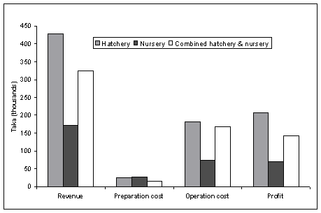 Average revenue, cost and profit with their standard deviations are shown in Table 7. The costs are highly variable, as is evident from their large standard deviations. In general, costs of operation are higher than preparation costs for all the three production systems studied. Although operational cost was lower for nurseries than for hatcheries and combined hatcheries/nurseries, the revenue earned and profit were also lower for nurseries than for the other two systems (Fig. 2). The average profit per ha water area was Taka 206,300 for hatcheries, while that for combined hatcheries & nurseries was Taka 142,300). The high variability in the market price of fry and fingerlings (Table 6) probably reflects the large fluctuation observed in the revenues earned by the nurseries. The average revenues for nurseries were Taka 172,200/ha.