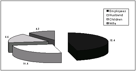 The study also revealed that most of the hatchery and nursery owners are highly dedicated to their farming activities, as 170 out of 174 farmers (97.7%) responded that they spent most of their time in aquaculture as compared to other activities such as paddy cultivation, other crops, livestock raising etc. Farmers often share their farming activities with their wives and children (Fig. 3). Study of the breakdown of time spent by the family members of hatchery and nursery owners shows that the husband spent about 10.4 hr, followed by the children (6.6 hr) and wife (4.3 hr). However, hatchery and nursery activities may be comparable to a small-scale, rural agro-based industry, rather than with small-scale rural aquaculture. The use of hired labour is quite high (average 18.4 hr/day) in hatcheries and nurseries (Fig. 3). This shows that hatcheries and nurseries are generating some form of employment in rural areas.