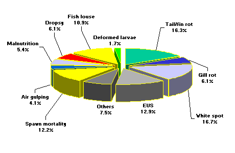 The impact of disease in hatcheries and nurseries was measured by fish mortality, economic loss, and also, if the farmers had changed their attitude due disease problems. In most facilities (66%), diseases caused partial loss of fry and fingerlings; only 7% of hatcheries and nurseries reported total loss of their stock, while 27% of the farmers reported no loss due to disease. For individual disease outbreaks, farmers reported varying losses. In hatchery and nursery operations, the following average mortalities were reported: malnutrition (55%), air gulping (43%), dropsy (42%), EUS (39%), sudden spawn mortality (38%), gill rot (34%), tail & fin rot (34%), argulosis (23%) and white spot (21%).