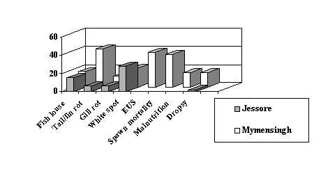 When ranking their problems, 118 farmers (67.8%) mentioned that they encountered diseases in their farms (Table 9). However, when specifically asked, 69% of the farmers said that they considered disease to be an important issue in hatcheries and nurseries. Disease was reported to be a more of a problem in the hatcheries and nurseries of the Mymensingh area, than in those of the Jessore area. The percentage of farmers reporting disease was 67%, 83% and 90% in hatcheries, nurseries and combined hatcheries/nurseries, respectively, in the Mymensingh area, while in the Jessore, area it was 61%, 54% and 0%, respectively. When the three production systems are compared, slightly more nurseries (72.9%) reported disease as one of their problems than did hatcheries (62.1%) or combined hatcheries/nurseries (66.7%).