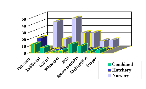 • The major diseases reported in nurseries are white spot, tail and fin rot, EUS, sudden spawn mortality, gill rot, dropsy and malnutrition, while the major diseases reported in hatcheries are sudden spawn mortality and argulosis.