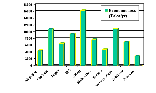 The average economic loss from diseases on those farms reporting disease was Taka 8062/ha/yr. However, the extrapolated loss for all 174 farmers included in the study was Taka 6275/ha/yr. The reported cost of treatment in hatcheries and nurseries was Taka 1669/ha/yr. The average profit was Taka 104,575/ha, and the loss due to disease was approximately 7.6% of the profit.
