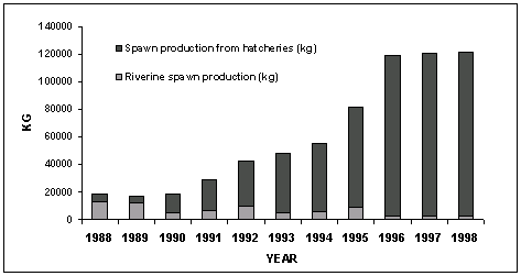 Figure 1. Comparative status of carp seed production from riverine sources and hatcheries from 1988 to 1998.