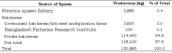 Table 2. Status of spawn production from riverine sources and hatcheries in Bangladesh during 1998 (source: Banik 1999).