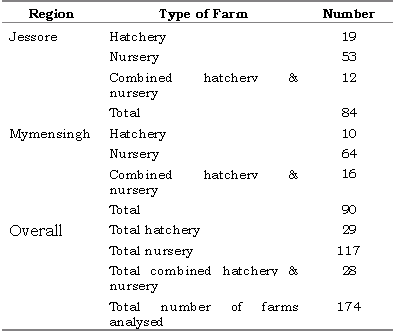 Altogether, 180 hatcheries and nurseries were surveyed (Table 3). Only private hatcheries and nurseries were surveyed; government hatcheries and nurseries were excluded from the study in consideration of the fact that 94.6% of the total spawn is produced by the private sector (Table 2). Data were collected by the enumerators directly from the hatchery/nursery owners using the questionnaire. Three enumerators were employed for Mymensingh region and two for Jessore region. The types of farm surveyed included hatcheries, nurseries and combined hatcheries and nurseries. Data were analysed from 174 of the 180 farms surveyed (six farms were omitted because information obtained from them was incomplete). A detailed breakdown of the types and numbers of farms analysed is given in Table 3. The information collected during the case study covers the period of one year from January-December 1998. Prior to the field-testing, background information on the number, location and distribution of hatcheries and nurseries was collected.