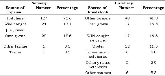The nursery owners were interviewed about their most likely sources of spawn and the hatchery owners about the sources of their broodstock. The source of spawn for nurseries was mainly from hatcheries (72.6 %); followed by wild caught (e.g., river - 13.7%), own grown (12.6%) and other farmers (0.5%) (Table 4). Similarly, the source of broodstock for the hatcheries was mainly from other farmers' ponds (41.3%), followed by own grown (16.3%), wild caught (16.3%), traders (11.5%), government and private hatcheries and other sources.