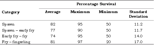 Table 5. Survival rates (%) of spawn, fry and fingerlings in hatcheries and nurseries.