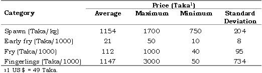 Fish spawn is generally sold by weight (kg), while fry and fingerlings are sold by number (thousands) in both Jessore and Mymensingh. Average prices for spawn, fry and fingerlings are shown in Table 6. Although there were variations in the price for different fish species, the information on average price was collected ignoring this species-wise variation. The average price of carp spawn was Taka 1154/kg, with the maximal and minimal price being Taka 1700/kg and Taka 750/kg. The average prices for early fry, fry and fingerlings were Taka 21, 112 and 1147 per 1000 individuals, respectively. There appears to be large variation in the minimum and maximum price of fry and fingerlings (Table 6). The minimum price of 1000 fry was Taka 40 and the maximum price was Taka 1000. Similarly, the maximum and minimum prices of 1000 fingerlings were Taka 3000 and 50. This shows that the market prices of fry and fingerlings were very much dependent on demand, and that the market demands are highly variable.