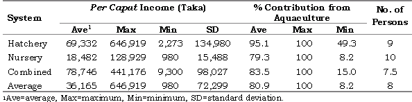 The average per caput income was highest in combined hatcheries/nurseries (Taka 78,746), followed by hatcheries (Taka 69,332) and nurseries (18,482) (Table 8). Although the average per caput income is reasonably high, especially for hatcheries and combined hatcheries/nurseries, the income is highly variable. The average contribution of aquaculture to household income is reasonably high, contributing from 79.3% (nursery) to 95.1% (hatchery). The contribution is, however, highly variable, especially for nursery and combined hatchery/nursery systems (see Table 8). The average number of persons in each household for the three systems varied from 7.5 to 10.