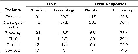 Sound health management practice is a key to success in any hatchery or nursery operation. In both the study areas, hatchery and nursery operators mentioned several problems they encountered in their operations. When ranking problems, 51 farmers (29.3%) mentioned the occurrence of disease as their major problem, while 48 (27.6%) ranked shortage of water was their major problem (Table 9). Other problems faced by the farmers were flooding, theft and extremes of temperature (too hot or too cold). In addition, some of the farmers mentioned lack of finance, frequent hartals (general strikes) and bad road communication as their major problems. Altogether, 118 (67.8%) and 133 (76.4%) of the farmers mentioned disease and shortage of water, respectively, as one of their problems (Table 9).