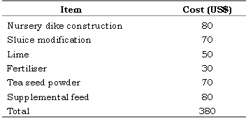The training and extension programme advocated the use of a 0.4 ha nursery for a 6 ha pond. Larger ponds should include more than one 0.4 ha nursery for better management. Recommended stocking densities are 20 to 25 postlarvae/m2 in order to release one juvenile shrimp/m2 into the main pond, based on an assumed survival rate in the nursery area of 60%. Prior to stocking, acclimation of postlarvae is recommended. To avoid predators and competitors and enhance survival in the nursery area, it was emphasised that proper water control, including the installation of net screens (89 holes/cm2) on water inlets, be maintained.