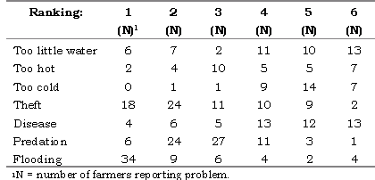 Farmers were asked to rank, in order of significance, the problems that they encountered (Table 2). The major problem was flooding, followed by theft. Disease was ranked fourth, and too little water was ranked sixth. Predation figured highly in the second and third ranking.