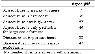Farmers' responses when asked what they thought about aquaculture are presented in Table 3. The majority of farmers considered aquaculture to be profitable and to have high status; only a few farmers acknowledged that aquaculture is a risky business. Disease was also seen as an important issue, but not in small-scale farms.