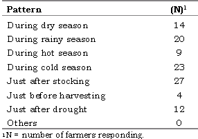 Farmers were asked if they associated any particular pattern with the disease occurrence (see Table 5). According to the farmers, most of the diseases occurred after stocking, as well as in the cold and rainy seasons.