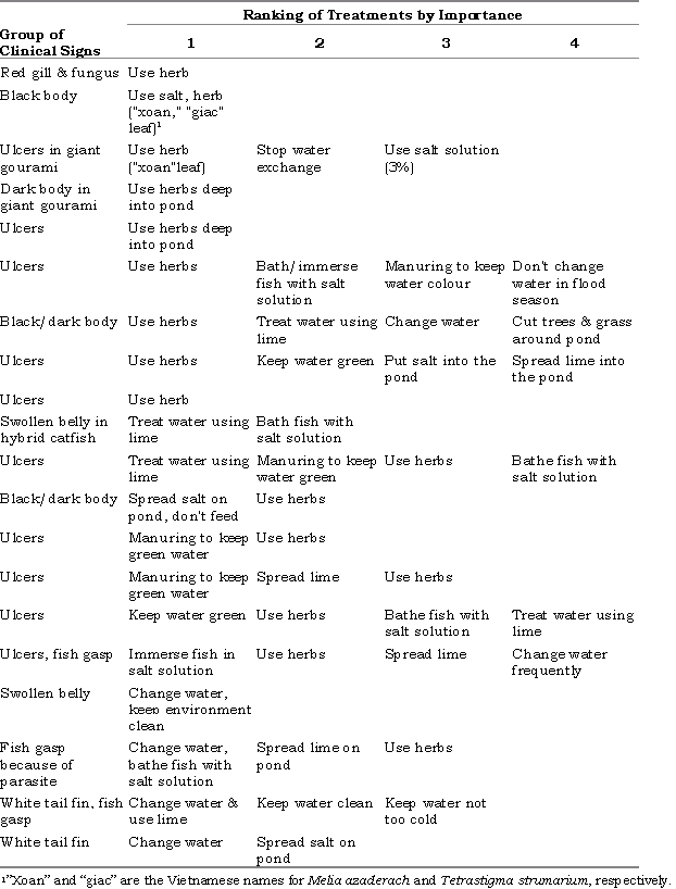 Farmers generally used two or more chemicals at a time for any disease problem, according to the recommendation of chemical suppliers. Farmers learned about the treatment that they used from government extension services (32 responses), chemical salespersons (30), other farmers (28) fry traders (15), feed salespersons (10) and hatchery owners (8). Six farmers reported that they learned the treatments themselves.