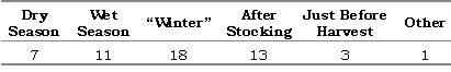 Farmers were asked how often these diseases were seen, and their response was that most were seen every year, but not more frequently. When asked when in the growing cycle the disease occurred, the farmers reported no distinct pattern of disease occurrence. However, as can be seen from Table 12, the cold and wet seasons were cited as the most likely times for disease to occur, as well as the period after stocking fry.