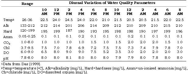 The floodplain wetlands (beels and bheries), the second-most important inland resource in India, are located in the states of West Bengal and Assam, and are mostly in various stages of eutrophication, the majority of them choked with submerged or floating vegetation and having sub-optimal water quality (Sugunan and Bhattacharjya 2000). This has affected the general fish health condition, and most fishes are stressed and have retarded growth. The water quality of Garapota Beel, a typical wetland fairly representative of the ecological status of such water bodies in India, is given in Table 3. The dissolved oxygen (DO) level is reduced to nearly 3.5 mg/L around 10 PM at night, and remains below this level for nearly eight hours, causing stress to resident fish. Moreover, un-ionised ammonia levels are in the range of 0.05-0.25 mg/L, which also act as a stress factor. As a result, the normal growth of fish has been affected, and the average yield of fish from this beel was 550 kg/ha.