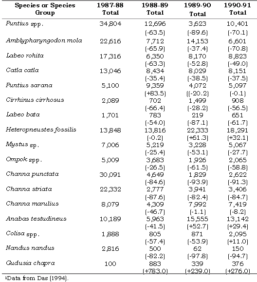 One of the major factors limiting assessment of the impact of specific disease outbreaks is inadequate baseline data on the production figures for different fish species caught from inland waters. This weak database on inland fisheries resources has been one of the serious constraints that has plagued the development process. Even market intelligence statistics suffer from various drawbacks due to the disposal of an appreciable quantity of catch directly from the primary producers to consumers. This is precisely the reason that limits evaluation of production losses in India due to disease and other causes. However, a picture of the decline in production due to EUS was obtained from a case study conducted at the Jorhat Fish Assembly Centre in Assam, India to evaluate the damage caused by the disease to fisheries of the Brahmaputra river system (see Das 1994) (Table 7).