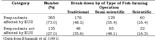 Table 9. Distribution of a sample of 500 respondents questioned on the occurrence and impacts of epizootic ulcerative syndrome.1